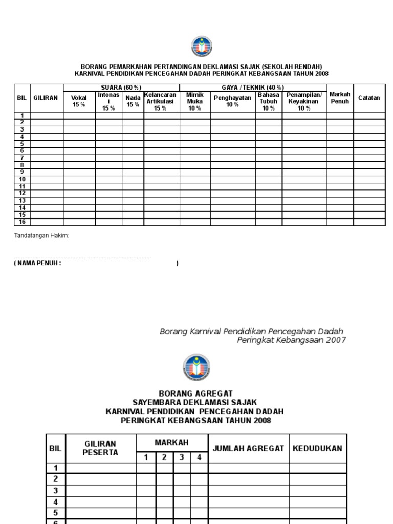 Borang Pemarkahan Pertandingan Deklamasi Sajak Sekolah Rendah Pdf Document. Program Sahsiah Cemerlang Moral Pendahuluan 116 - 117 Pertandingan Deklamasi Sajak 119 - 127 Pertandingan Kuiz Perdana 128 - 129. Borang Penghakiman Pertandingan Kompang Selawat Sekolah Rendah Sekolah-sekolah Kementerian Pendidikan Malaysia Bahagian Paluan 35 Markah Giliran Kumpulan.