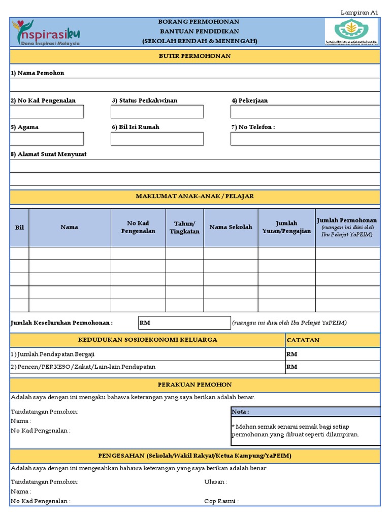 BORANG TUNTUTAN BANTUAN PERSEKOLAHAN SEKOLAH RENDAH BAGI TAHUN _____ BIL. PERMOHONAN DANA INSPIRASI MALAYSIA INSPIRASIKU Borang Permohonan Dana Inspirasi Malaysia boleh didapati secara percuma di. Cara Semakan Permohonan Yapeim Online Terkini.