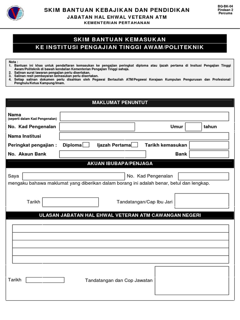 Borang permohonan hendaklah diisi. 12072020 borang permohonan bantuan kebajikan jhevbk2019 BANTUAN KEMASUKAN KE UNIVERSITI AWAM POLITEKNIK Anak-anak Veteran ATM yang melanjutkan pengajian ke Universiti Awam atau Politeknik boleh buat permohonan Bantuan Kemasukan ke UA Politeknik dan terima bantuan sebanyak RM1000 di peringkat Diploma dan RM1500 di peringkat Ijazah. LOGIN JHEVDAFTAR PERMOHONAN.