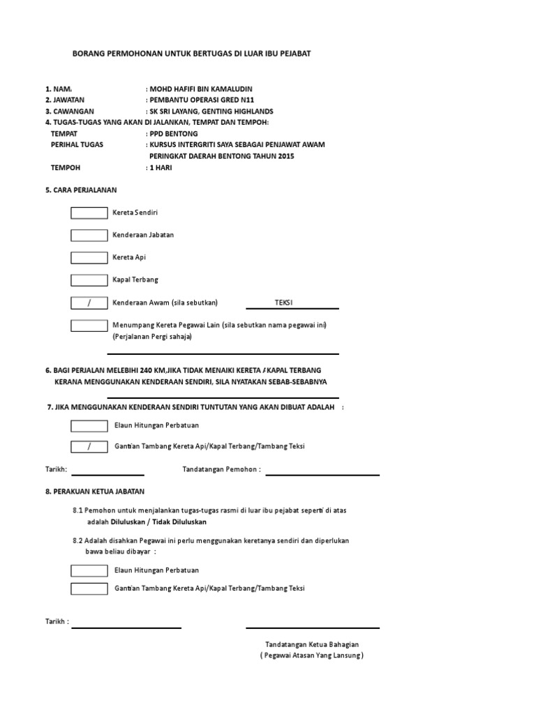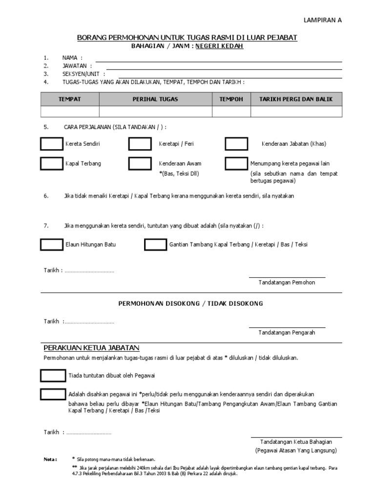 Borang permohonan menjalankan tugas rasmidi luar ibu pejabat. Tugas tugas yang dijalankan tempatnya dan tempoh. DiluluskanAdalah disahkan pegawai ini perlu menggunakan keretanya sendiri dan diperakukan bahawa beliau dibayar -. Sila potong mana-mana tidak berkenaan Jarak perjalanan yang melebihi 240km sehala dari Ibu Pejabat adalah layak dipertimbangkan elaun tambang gantian kapal terbang atau keretapi.