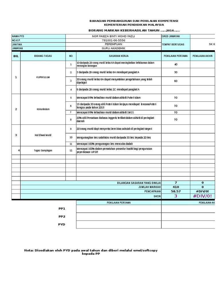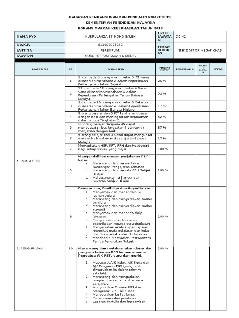 Home current Explore Explore All. BAHAGIAN PEMBANGUNAN DAN PENILAIAN KOMPETENSI KEMENTERIAN PENDIDIKAN MALAYSIA BORANG MARKAH KEBERHASILAN TAHUN 2016 NAMA PYD MAIZI ANIZA BT NAWI GRED JAWATAN NOKP. A short summary of this paper.
