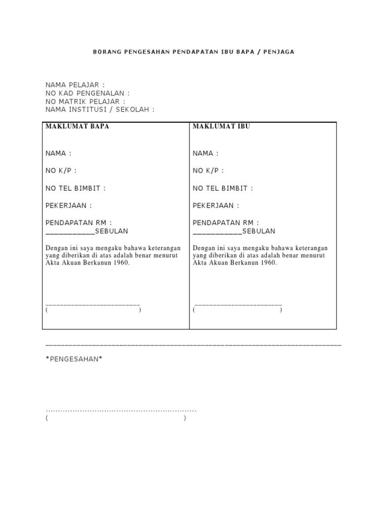 Borang Pengesahan Pendapatan Ibu Bapa Pdf